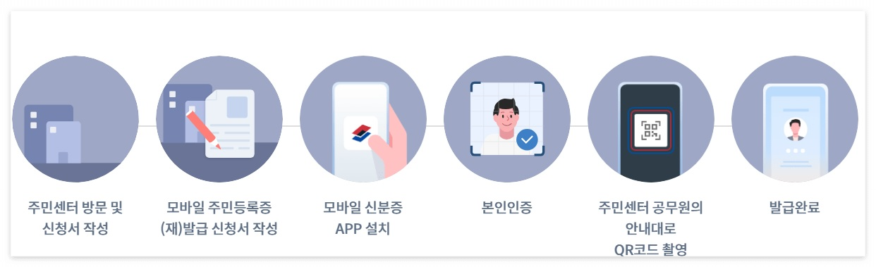 거주지내 주민센터를 방문하여 QR코드로 발급받을 수 있습니다. 발급받은 QR코드를 스캔하여 스마트폰에 주민등록증을 저장합니다. 스마트폰을 분실이나 변경했을 경우에는 주민센터를 방문하여 새로 발급받아야 합니다.